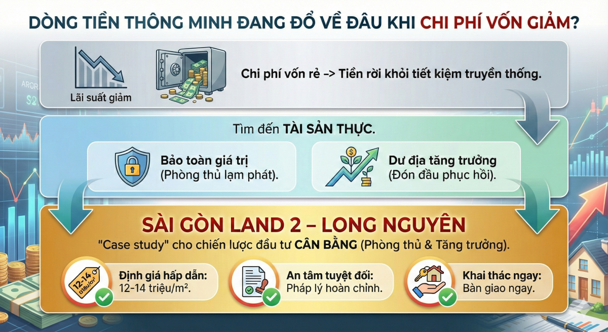 Lịch sử các chu kỳ kinh tế trước đây đã chứng minh, mỗi khi chi phí vốn giảm xuống, dòng tiền thông minh thường có xu hướng dịch chuyển rời khỏi kênh tiết kiệm truyền thống để tìm đến các lớp tài sản thực.