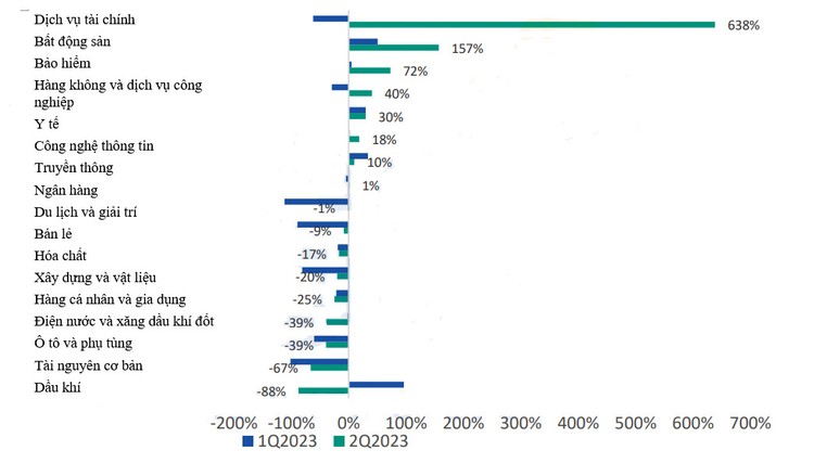 Theo số liệu tổng hợp của Công ty CP Chứng khoán Ngân hàng Đầu tư và Phát triển Việt Nam (BSC), tổng lợi nhuận các doanh nghiệp đại chúng trong quý II/2023 đạt khoảng 77.401 tỷ đồng, tiếp tục sụt giảm 16,9% so với cùng kỳ năm ngoái, tuy nhiên đà giảm đã có dấu hiệu chậm lại so với quý I/2023 (giảm 19,6%). Trong đó, ngành điện nước, xăng dầu, khí đốt giảm 65%; ngành thực phẩm, đồ uống giảm 49%; ngành hóa chất giảm 65%; ngành bán lẻ giảm 8,5%; ngành hàng cá nhân - gia dụng giảm 24,7%. Ngoài mức nền cao quý II/2022, sự sụt giảm đến từ sức mua tiêu dùng kém, tăng trưởng kinh tế chậm lại.